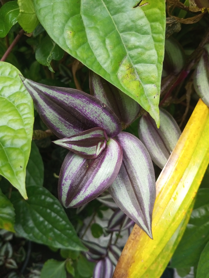 In the city of Mindat, Myanmar, a close-up image displays a vibrant *Tradescantia zebrina* plant amidst other foliage