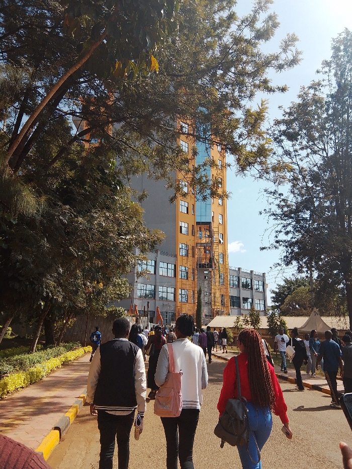 The image depicts an outdoor scene in Karingani ward, Kenya, on a clear, sunny day. A paved pathway, outlined by yellow and black curbs on its left, extends from the foreground into the mid-ground. To the left of the pathway, a low green hedge borders a treed area with dense foliage. In the background, a multi-story building is prominent, featuring a gray facade with vertical sections of orange cladding and numerous windows, some with blue reflective glass. Scaffolding is visible on the right side of the orange section, suggesting construction or renovation. Trees and vegetation frame the building on both sides. Approximately 20-30 individuals, primarily young adults, are walking along the pathway, moving away from the viewer. Three individuals are in the immediate foreground, seen from behind: 1. On the left, a person wearing a black jacket with white sleeves and dark pants, holding a light-colored object in their right hand. 2. In the center, a person wearing a white long-sleeved top and dark pants, carrying a pink shoulder bag over their left shoulder. 3. On the right, a person with long, braided reddish-brown hair, wearing a red long-sleeved top, blue jeans, and a gray backpack, holding a mobile phone in their right hand. Other individuals in the mid-ground are also walking on the pathway, dressed in casual clothing. A white tent structure is partially visible in the far mid-ground on the right. The sky is bright blue with minimal cloud cover.