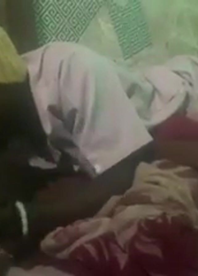The video depicts a man with dark skin and a beard, wearing a white shirt and a light yellow knit hat, lying on a bed with various blankets. He is bent over, appearing to focus on something in front of him. The background is indistinct, but there is a wall with a geometric pattern. A person in white clothing stands near the head of the bed.