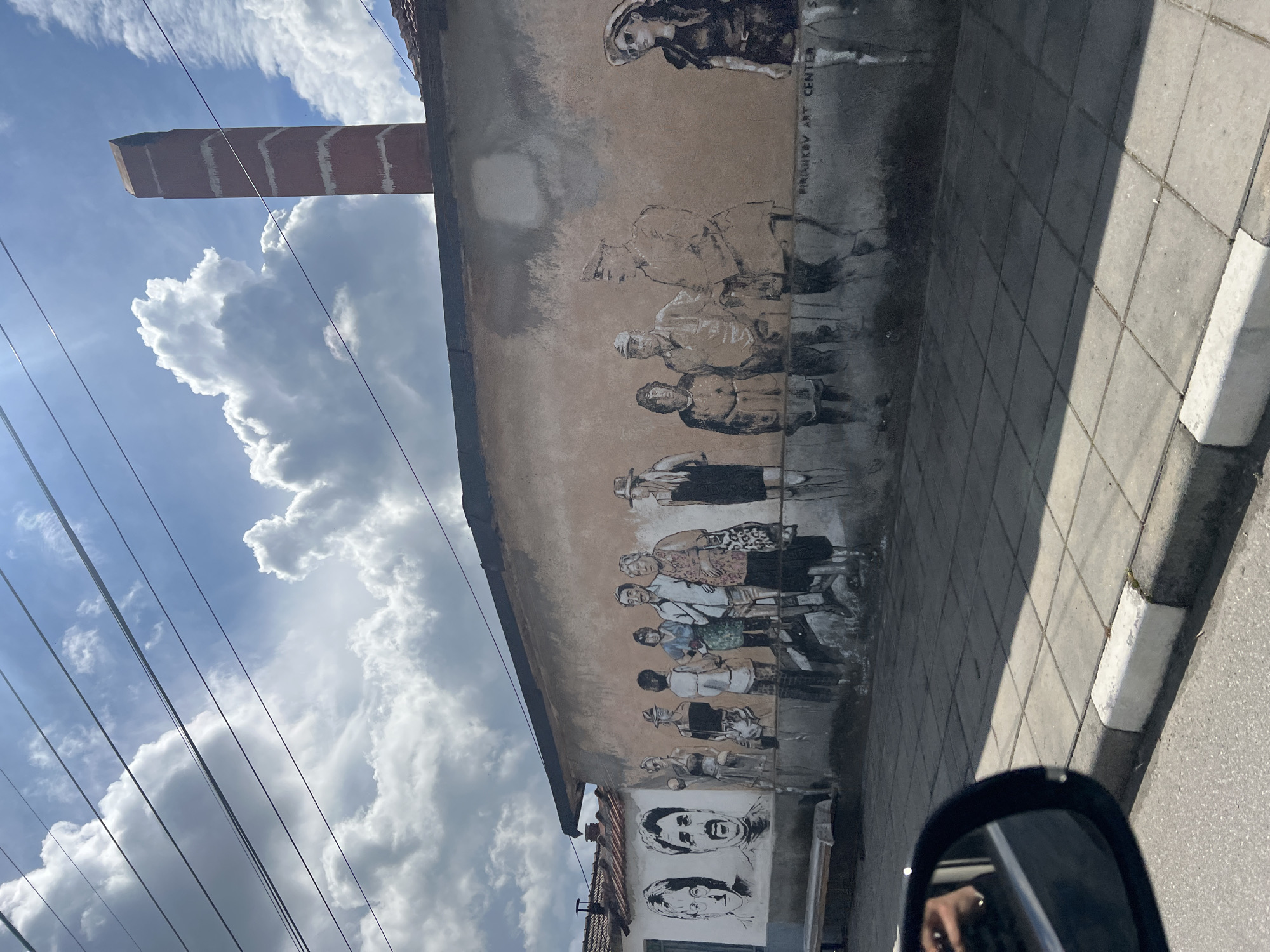 The image depicts a street scene in Staro Zhelezare, Bulgaria, dominated by a light brown, single-story building wall covered with numerous black and white murals. The wall features a diverse array of stylized human figures, appearing to be portraits and full-body depictions arranged in a continuous line. On the far left, two head-and-shoulder portraits of men are visible above a long, light-colored wooden bench positioned against the wall. To the right, approximately ten additional figures are depicted standing. These include men and women in various attire, some wearing hats or holding bags. Notably, a figure in a military-style uniform with a cap is present towards the right side of the mural group, next to an older woman holding a patterned bag. Further right, a woman wearing sunglasses and a hat stands alone. The text "PIRINIKOV ART CENTER" is faintly discernible in black lettering on the lower right portion of the mural. Above the building, a prominent red brick chimney with white mortar lines rises against a bright blue sky filled with large, white cumulus clouds. Multiple black power lines or telephone wires traverse the upper section of the sky. The building roof, visible on the left, features terracotta-colored tiles. In the foreground, a grey tiled sidewalk with a distinct white-painted top curb separates the building from an asphalt road. The lower-left corner of the image includes the side mirror of a vehicle, reflecting a hand holding a mobile phone, indicating the perspective from which the photograph was captured. Strong sunlight is evident, casting shadows across the tiled sidewalk.