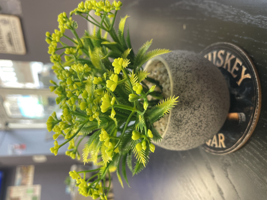 The image presents a forensic, matter-of-fact view of an artificial potted plant on a dark tabletop within an indoor commercial setting located in Blagoevgrad, Bulgaria. The primary subject is a dense, small artificial plant characterized by numerous clusters of bright yellow-green plastic flowers or buds, complemented by pointed, light green plastic leaves. This plant is situated in a spherical, grey pot with a speckled texture, containing small, light-colored decorative pebbles or gravel at its base. The pot rests on a circular, dark-colored coaster. Visible gold-toned lettering on the coaster includes the inverted and partially visible word "WHISKEY," and partially visible "CIGAR," alongside an image depicting a lit cigar with emanating smoke. The tabletop beneath the coaster is dark, exhibiting a subtle texture consistent with wood grain. The background is out of focus, showing a blurred interior. Walls appear dark grey or bluish-grey. Distant, blurred light sources and reflections suggest large windows or a glass entryway, implying an external environment beyond the establishment. Vague shapes on the walls indicate framed items or posters. No people are present within the frame. The scene conveys the environment of a bar, lounge, or similarly themed commercial venue.