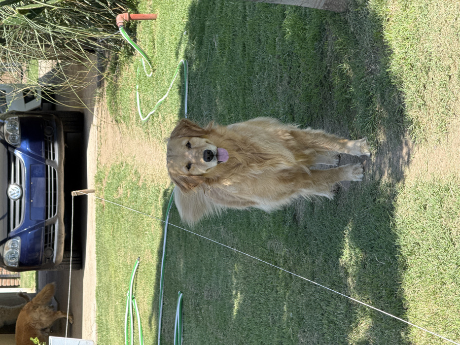 A golden retriever stands on a grassy lawn with its tongue out. Behind the dog, a blue car is parked on a paved surface near foliage. A green garden hose is visible across the lawn. Another dog is partially visible behind the blue car. The scene is captured in daylight.