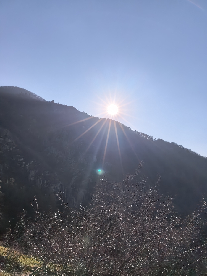 The image depicts a mountain landscape within the Ustina region of Bulgaria under a clear, bright blue sky. A prominent sun, positioned slightly right of the upper center, emits a strong starburst effect with visible rays extending downwards and outwards. A large, dark mountain or hill dominates the left and central portions of the frame, its upper ridge featuring sparse, silhouetted trees. The mountain's slopes are steep, revealing rocky outcrops and what appears to be bare, winter vegetation or leafless deciduous trees. A faint atmospheric haze partially obscures the mountain's contours. In the foreground, centered and extending towards the lower right, a dense, leafless bush or small tree with intricate, fine branches is heavily backlit by the sun, causing its branches to glisten. Patches of dry grass are visible on the ground beneath the bush in the lower left. A distinct cyan-colored lens flare artifact is present below the sun's primary position. No people, explicit actions, or interactions are observable.