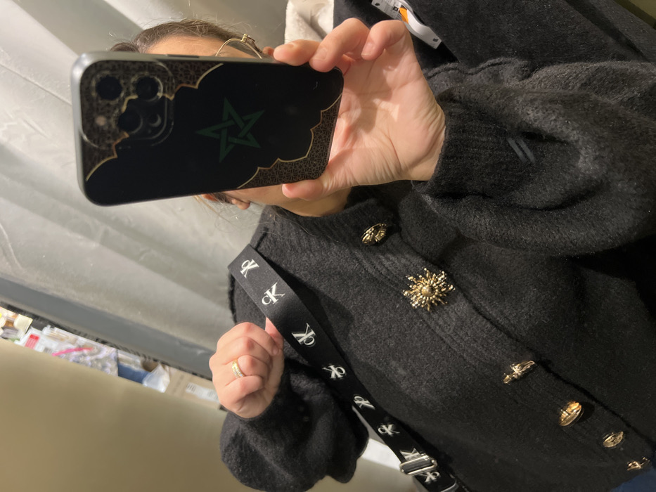 An individual is depicted taking a mirror selfie inside an establishment in Mondeville, France. The person, mostly obscured by their smartphone, wears a dark, possibly charcoal-grey or black, chunky knit cardigan or jacket featuring large, ornate golden buttons down the front. A prominent golden, sunburst-shaped brooch is affixed to the left chest area of the garment. A black strap with repeated white "CK" logos, indicative of a Calvin Klein item, is visible diagonally across the person's torso. On the left hand, a multi-band gold-toned ring is worn on the ring finger. The individual holds a dark-colored smartphone, likely an iPhone, with their right hand, covering most of their face. The phone case is black, adorned with a central green five-pointed star and intricate gold-colored decorative patterns resembling a book cover along its edges and around the camera module. Parts of thin, gold-rimmed glasses are visible on the person's face behind the phone. The background is out of focus, showing reflections in what appears to be a mirror, with indistinct shapes suggesting shelves, racks, or other retail environment elements.