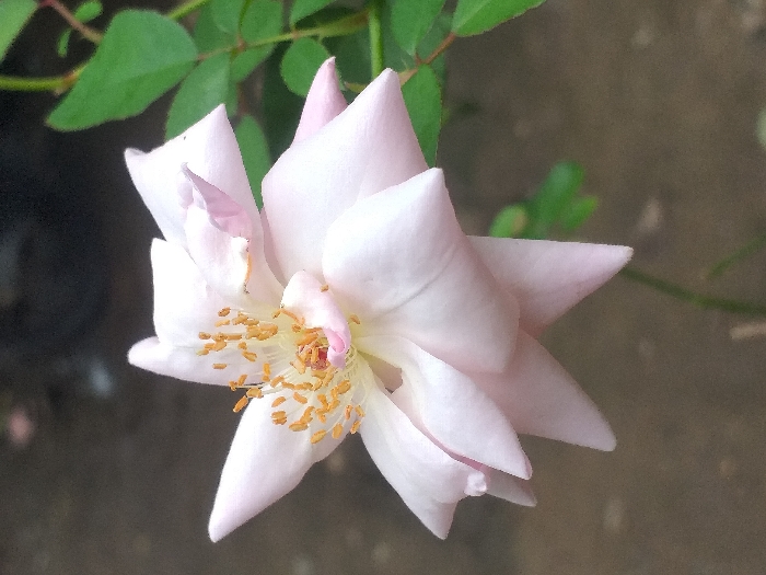 A pale pink rose blooms with pointed petals, forming a star-like shape. Its center is a burst of yellow-orange stamens. The flower is in focus, set against a blurred background of green leaves and a grayish surface. The petals display subtle variations in color, with some edges appearing slightly darker. The rose captures a moment of delicate beauty.