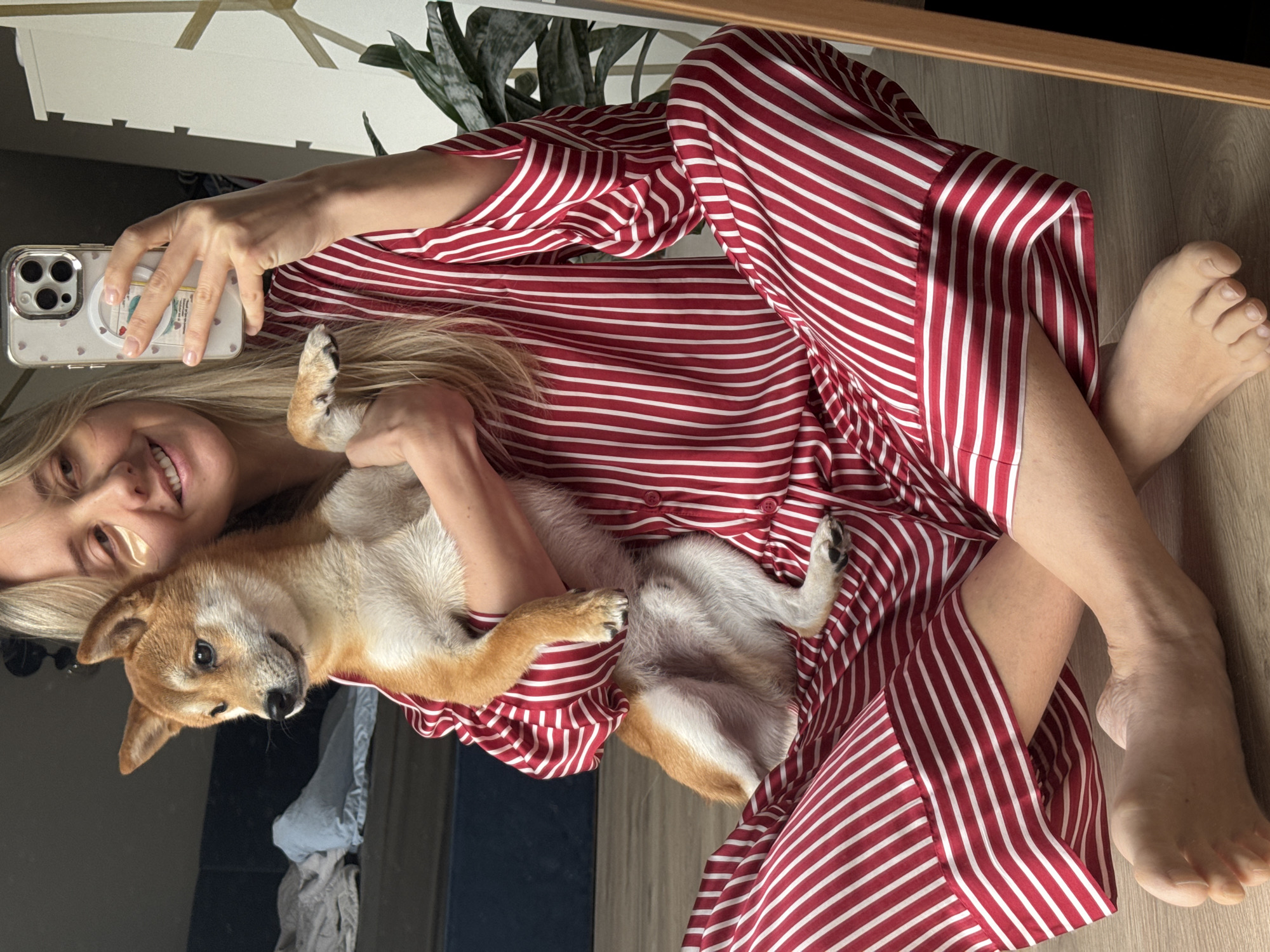 An adult female is depicted indoors, seated on a light-colored wooden floor with legs crossed. She is holding a Shiba Inu dog and taking a selfie. The female subject has blonde hair, is smiling, and exhibits two gold-colored under-eye patches. She is dressed in a red and white striped pajama set. Her right hand holds a white iPhone, equipped with a clear, heart-patterned case and a circular grip accessory, positioned for a selfie. The Shiba Inu, with light brown and white fur, is cradled in her arms, its gaze directed to the viewer's right. The background features a dark blue bed with light-colored bedding on the left. To the right, a white furniture unit with geometric gold accents, a green potted plant, and the edge of a wooden-framed mirror are visible. The scene is located within a domestic interior in Carnikava, Latvia.