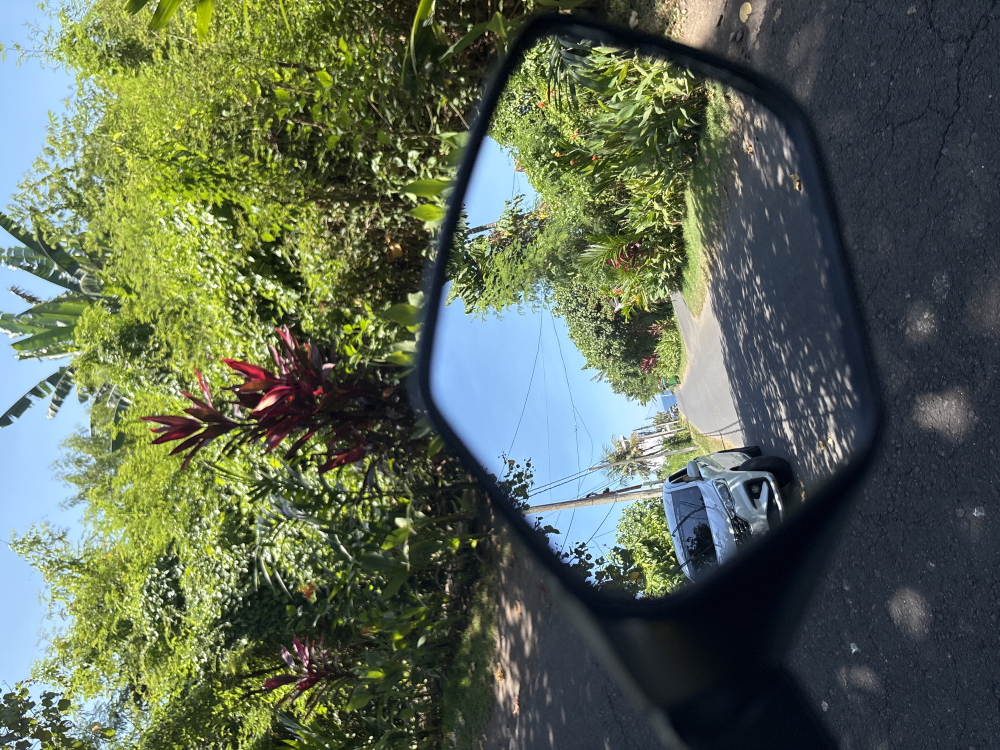 The image is a view from a side mirror on a motorcycle or vehicle, showing the road and surroundings behind. The location is likely in a tropical, lush environment near Blahbatuh, Indonesia, given the dense vegetation. The reflection shows a road with a silver car, utility poles with wires, and houses in the distance. The roadside is lined with green foliage including red leaved plants. The mirror and foreground are blurred. The road surface is asphalt.