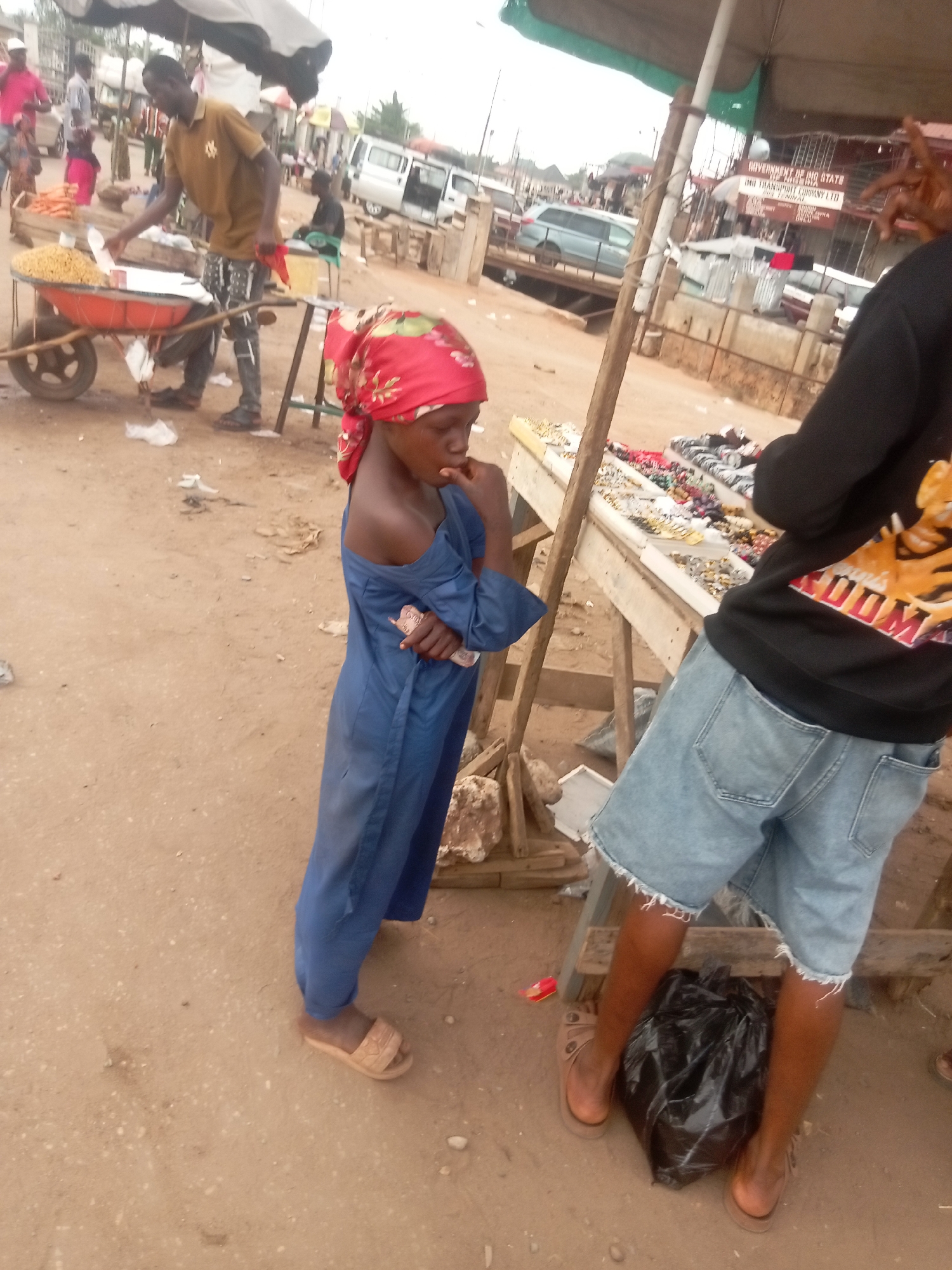 The image depicts an outdoor scene in what appears to be a bustling market area in Onitsha, Nigeria. A young girl wearing a blue dress and a red headscarf stands near a table displaying various items, possibly jewelry. She holds money in her hand and appears to be contemplating a purchase. Beside her, a person wearing denim shorts and a black sweatshirt with a tiger on the back stands near the table. A black plastic bag is on the ground between their feet. In the background, a man stands beside a cart filled with goods, likely selling them. Other individuals and vehicles are visible in the distance, suggesting a busy urban environment. A sign indicates "Government of IMO State" and "Imo Transport Company Ltd". The ground appears to be dirt and sand.