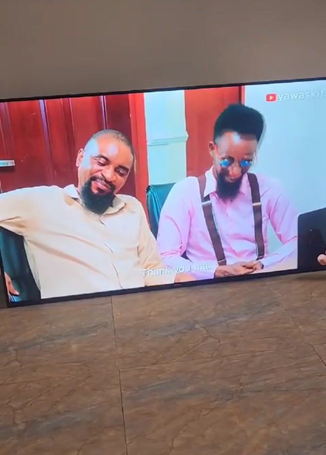 flat-screen television displaying a scene from a program. Initially, two men are visible; one wears a light-colored shirt, and the other wears a pink shirt with suspenders. The man in the light shirt has a beard. The other man has a beard and glasses. The program then cuts to a woman wearing a pink shirt. All three people are seated. The television is positioned on a brown tile floor. A YouTube handle is visible in the upper right corner of the screen. Someone is holding a black tablet in front of the TV.