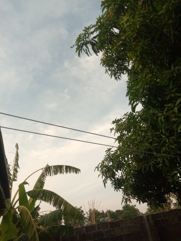 The image presents an upward-looking exterior view in Gaklang, Nigeria. A light blue sky with scattered white cirrus clouds occupies the majority of the upper frame. In the upper-right and mid-right, a dense, dark green mango tree canopy is prominent, showing numerous ovate leaves and what appear to be nascent flower spikes or new growth. Below this, two taut, dark horizontal wires, likely electrical or communication cables, cross the mid-ground. To the lower-left and mid-left, a banana plant is visible, featuring a large, partially tattered green leaf curving upwards and horizontally, along with other greener foliage. The far left edge includes a dark, angled structure, possibly a roofline. A dark brown cinder block wall forms the base of the scene across the bottom, with blurred distant foliage and some dried vertical vegetation visible behind it in the center-right. No individuals or active interactions are depicted.