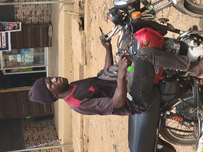 An adult male with dark skin and a black beanie is seated barefoot on a red motorcycle, positioned centrally in the frame