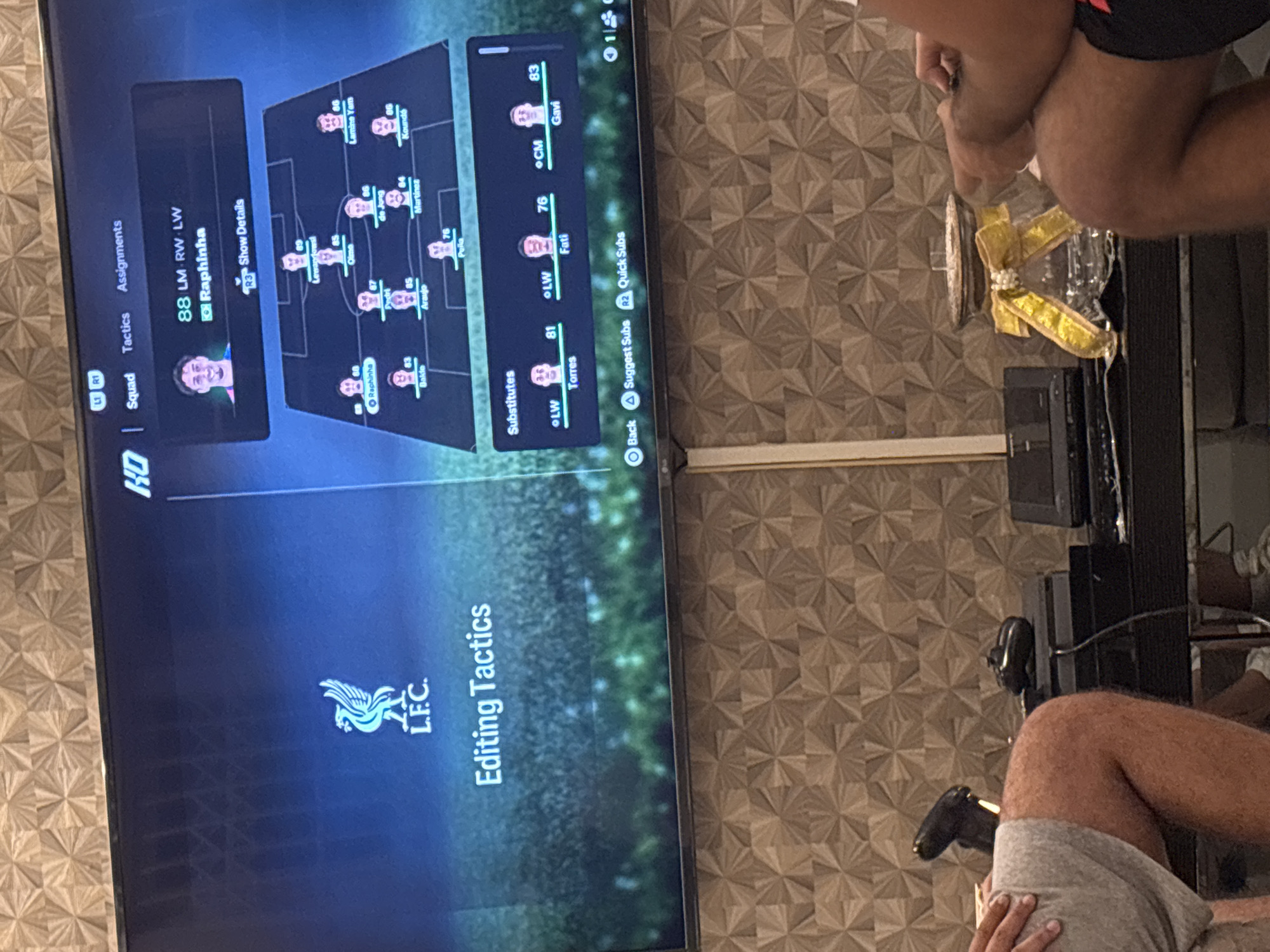 person playing a soccer video game, specifically "FIFA" based on the Liverpool F.C. logo displayed on the screen. The game interface shows a player named Raphinha in a squad tactics screen, along with other players and substitute options. The scene takes place indoors. Two individuals are sitting on the floor in front of the television, one is playing the game with a controller. There is a Playstation present on the shelf next to the television. A trophy is also visible on the shelf, wrapped in gold ribbon. There is a geometric pattern on the wall. There is no information to suggest that the scene is in Durban, South Africa.