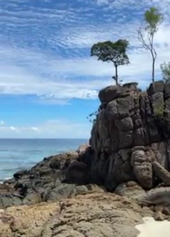scenic coastal landscape under a partly cloudy sky. The foreground features rugged, rocky terrain with varying shades of brown and gray. In the initial shot, a cluster of dark gray rocks is topped with a few trees, one of which is notably full and green. The camera pans right to reveal the ocean. The water transitions from a light turquoise near the shore to a deeper blue further out. Gentle waves lap against a small, sandy beach tucked between the rocks. The sky is filled with scattered white clouds against a bright blue backdrop. There are no visible people or signs of active human presence in the video.