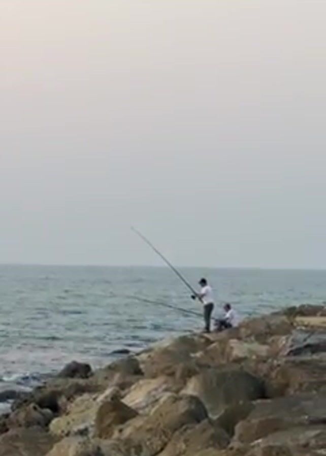 Two people are fishing on a rocky shoreline. One person is standing while the other is sitting. Both hold fishing rods. The sea is calm with small waves. The sky is overcast. A bird flies in the sky in the distance.