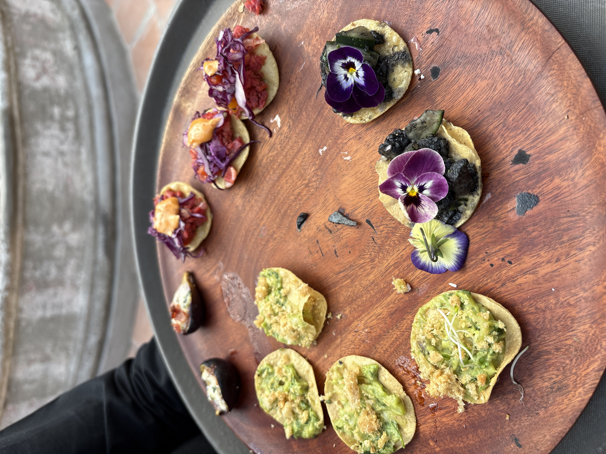 A wooden tray holds an assortment of bite-sized appetizers or canapés. From left to right, they consist of purple cabbage with a reddish base and orange sauce, a dark-colored topping adorned with purple pansies, avocado-based toppings, and sliced figs. The tray is being held by someone wearing a black-sleeved shirt. The location is Progreso, Mexico.