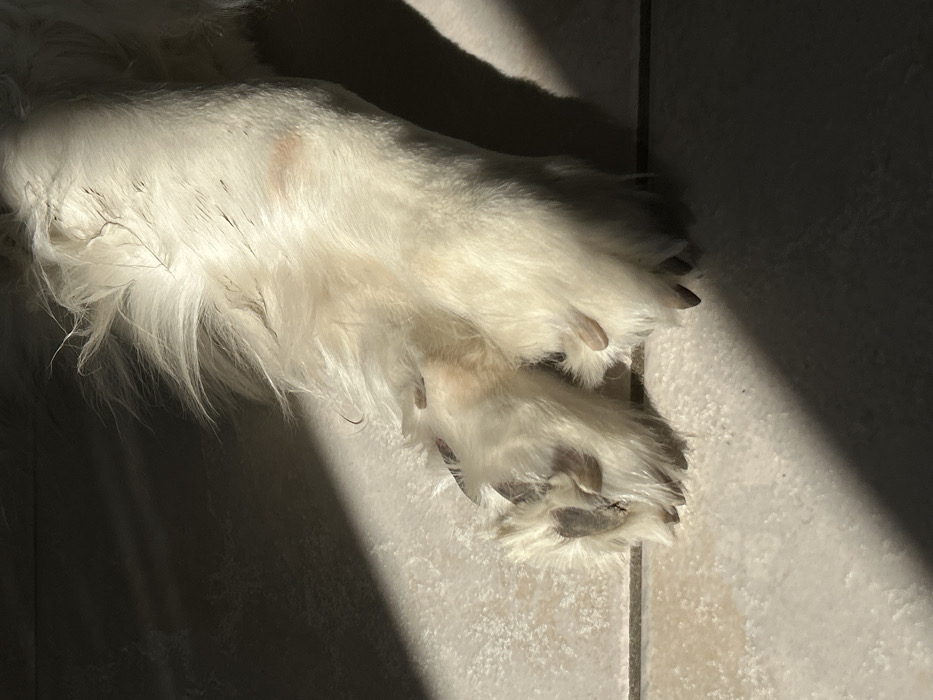 The image displays the foreleg and two paws of a domestic canine, consistent with a large breed exhibiting cream-to-white fur, resting on a light-toned tiled floor in Truchtersheim, France. The fur on the animal's limb appears somewhat disheveled, with scattered dark strands or debris visible within the lighter coat, particularly around the paw areas. The paw pads are dark, and the visible claws are dark-tipped. Two distinct dewclaws are present on the medial aspect of the visible foreleg. A faint, reddish-pink circular discoloration, approximately 1.5 cm in diameter, is observed on the dorsal surface of the lower leg, proximal to the visible paws. The floor consists of light, possibly beige or cream-colored, square ceramic tiles with visible grout lines. A strong, directional light source, characteristic of sunlight, illuminates the scene from the upper left, casting a prominent, sharp diagonal shadow across the lower right portion of the frame and over parts of the animal's limbs. No human subjects, explicit actions, or direct interactions are depicted in the scene.