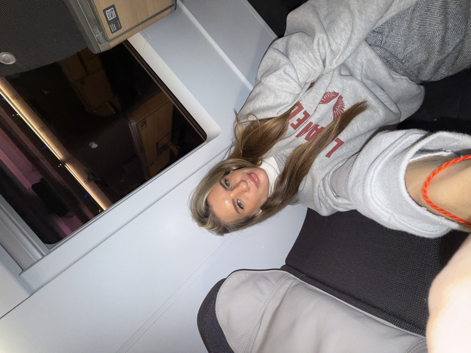 A young woman with long, light brown hair is reclining on a plane seat. She wears a grey sweatshirt over a white turtleneck. The sweatshirt has red lettering. She has a red string bracelet on her wrist. A window is to her left. The seat and window panel are grey and white.