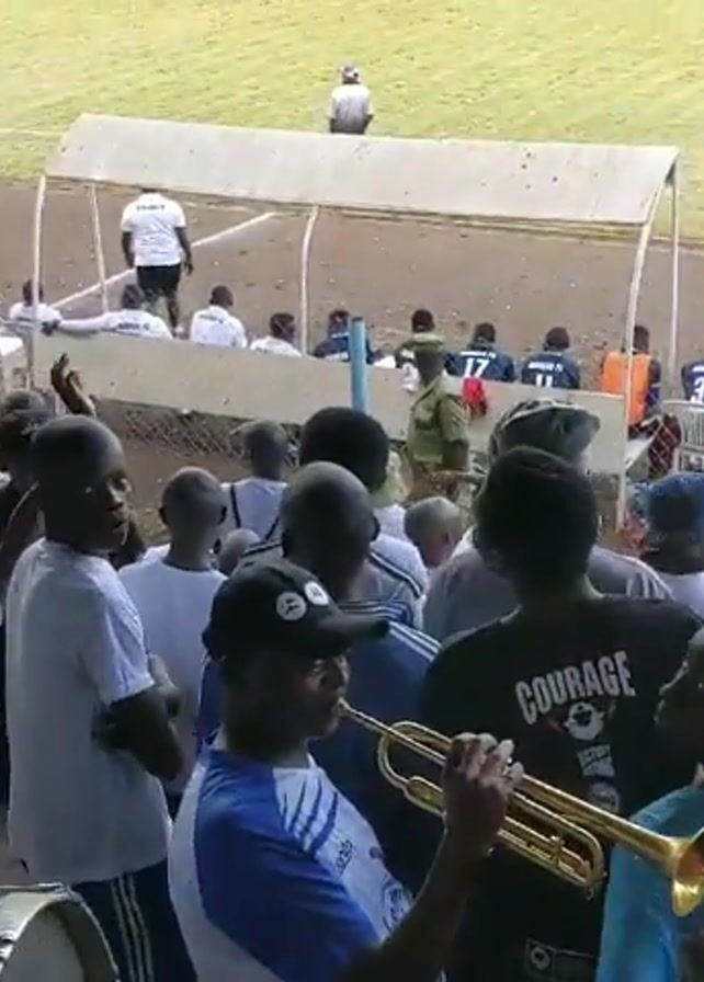 soccer game at Ushirika Stadium. The camera is positioned under the stadium's roof, looking out at the field. A crowd has gathered, some wearing team colors. Some people are playing trumpets in the foreground. Players in red uniforms are on the field. There is a bench with people sitting on it along the sidelines. A uniformed security guard stands nearby. In the background, a hilly landscape can be seen.