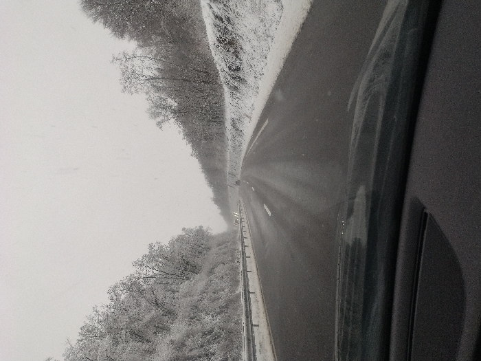 The image captures a winter scene on a multi-lane highway in Crusnes, France, under an overcast sky. The view is from inside a vehicle, with a dark dashboard and the lower portion of the windshield visible in the foreground. The asphalt road surface is dark and appears wet or slushy, marked with white lane lines. Both sides of the highway are bordered by snow-covered verges and embankments densely populated with trees and bushes, all heavily frosted with white snow. A metallic guardrail runs along the left shoulder of the road. In the mid-distance, several vehicles are observed traveling in the same direction, indicated by faint points of light from their illumination. Visibility is reduced by the prevailing snowy or hazy atmospheric conditions.