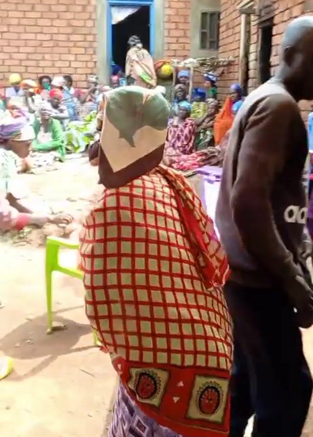 gathering of people, mostly women, sitting on the ground outside a brick building. A man dressed in traditional patterned clothing stands in the foreground, facing the group. A man in a blue blazer and purple pants stands near the building. Later, a man in a red shirt and purple pants walks into the frame. There are plastic chairs, a purple box, and miscellaneous items scattered around the outdoor space. The atmosphere appears to be casual and social.