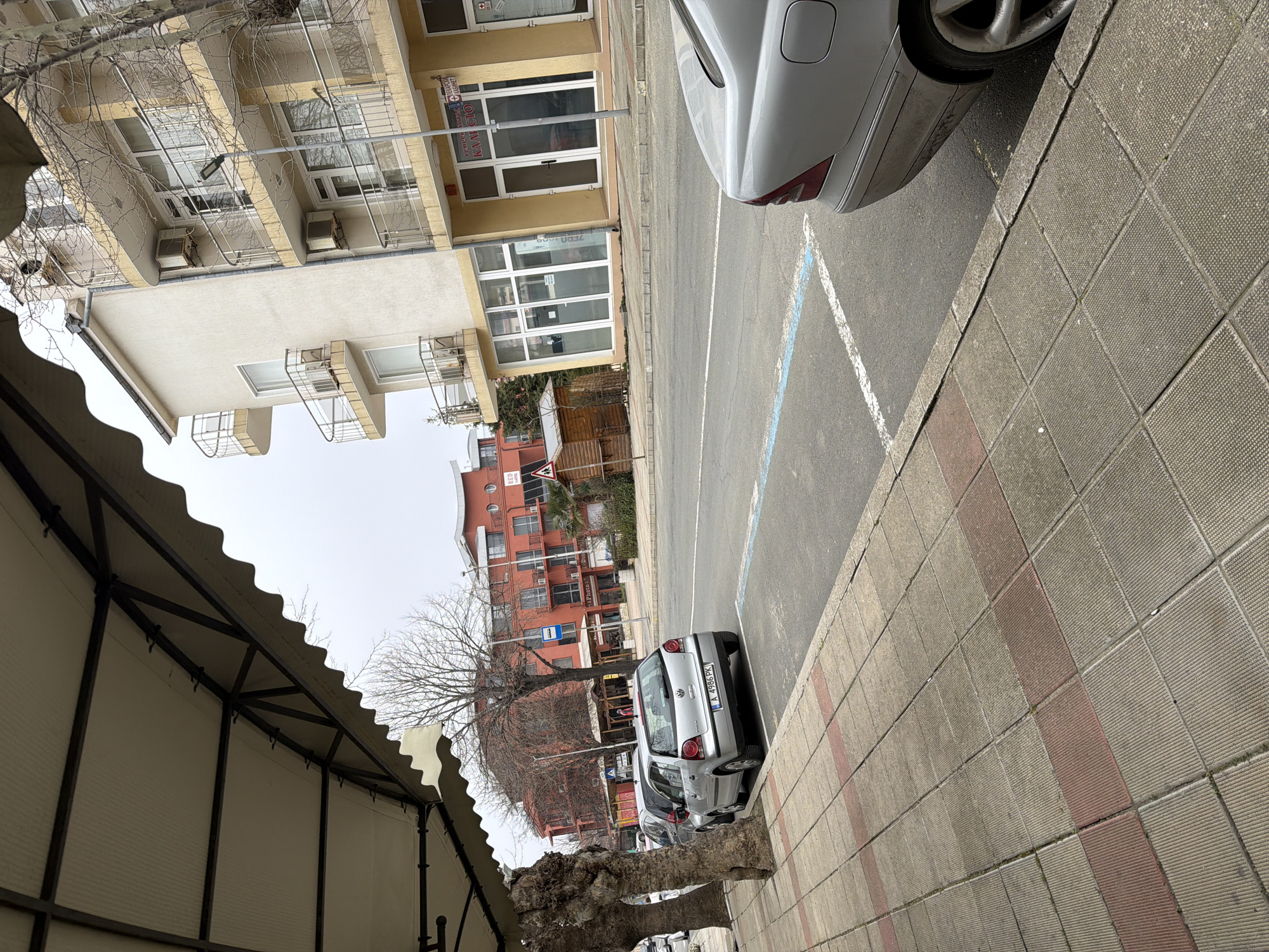 The image depicts an urban street scene in Lozenets, Bulgaria, viewed from a sidewalk under a cream-colored fabric awning with a dark metal frame. In the foreground, a concrete paver sidewalk, primarily light gray with interspersed reddish-brown rectangular sections, extends from the lower left to the right. To the right, the rear quarter of a silver Mercedes-Benz sedan is partially visible, parked parallel to the curb. Along the left edge of the sidewalk, several bare, gnarled deciduous trees with thick trunks are present. Beyond the sidewalk, an asphalt road runs parallel to the viewer. Parking spaces are delineated by white dashed lines, and a section of the curb is marked with a solid blue line, indicating a specific parking zone. Two vehicles are parked along the road; a silver Volkswagen Polo (license plate A 4986 PK) is clearly visible facing away from the camera, and another silver sedan is partially obscured behind it by one of the tree trunks. In the midground, on the opposite side of the street, a multi-story building with a red exterior and balconies is visible. Further to the right, a multi-story building with a cream-colored facade and yellow lower section features multiple balconies with metal railings and several external air conditioning units. The ground floor of this building contains storefronts with large glass windows. One storefront displays partial text, "КАЛИ СТО" and "БИЗНЕС". A black streetlight pole stands in front of this building. To the left of the cream building, a small, rustic wooden kiosk with a brown roof is situated near the road, along with a blue bus stop sign and a yellow triangular pedestrian crossing sign. The sky is overcast and appears light gray. No individuals are visible in the scene.