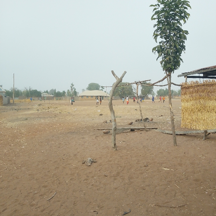 An overcast day shows a dusty field with scattered debris. People are playing soccer in the distance. A wooden structure with a thatched wall stands on the right, near a slender tree. In the foreground, weathered wooden supports create a makeshift frame. Other buildings are visible on the perimeter of the field. The ground is mostly bare and arid.