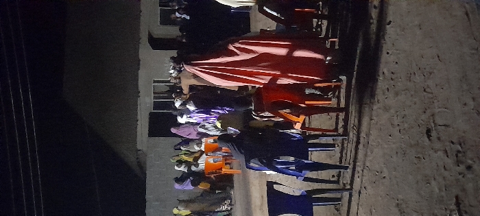 A group of people, mostly women, are seated on chairs, arranged in rows, in front of a building. Most of them wear headscarves. A red cloth is draped over some of the individuals in the middle row. The lighting is dim, suggesting that the photo was taken at dusk or night. The ground appears to be dirt or gravel.
