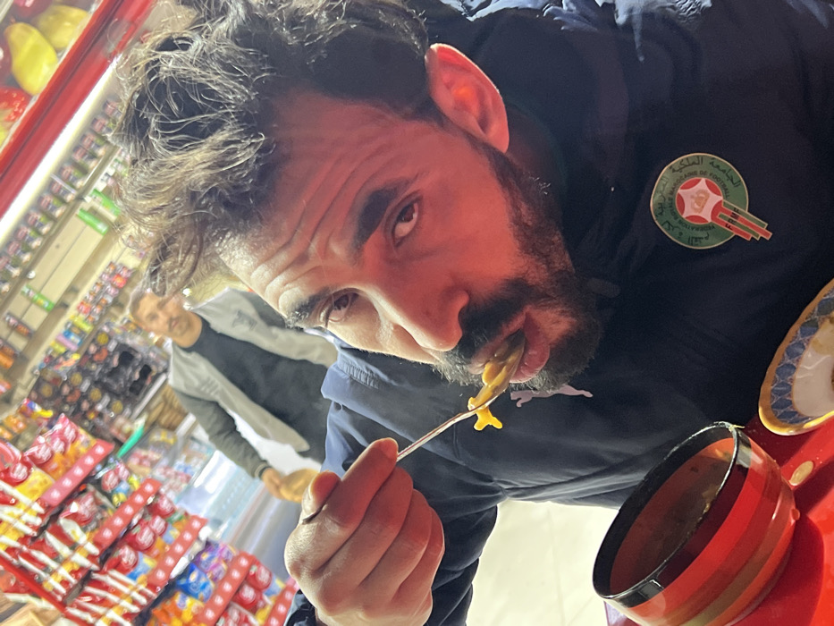 A close-up shot captures a bearded man eating from a fork. He wears a dark jacket with a circular emblem pinned on it. To the left, another man is visible in the background. In the foreground, a red table displays a bowl with red and black stripes. Shelves of various snacks are visible on the left side of the frame. The image appears to be taken inside a store or a restaurant.