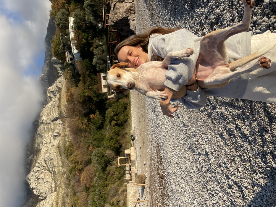 - "The image depicts a female holding a dog on a pebble beach in Drobnići, Montenegro" by FM-mkWXI3, licensed under CC BY 4.0