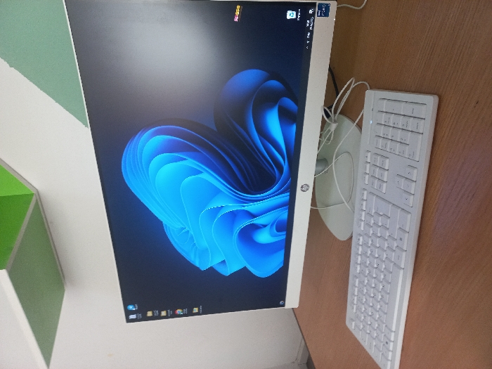 The image displays a workstation on a wooden desk within an indoor environment in Fergana City, Uzbekistan. A white HP brand monitor is centrally positioned, displaying the Windows 11 operating system's default blue abstract wallpaper. Multiple application icons are visible along the left side of the monitor screen, and taskbar icons are present in the bottom right corner. A white full-size keyboard, featuring a numeric keypad, rests on the wooden desk surface directly in front of the monitor. White cables are visible extending from the rear of the monitor. The background consists of white walls, with two green, geometric acoustic panels affixed to the ceiling-wall junction. No individuals are present in the scene.