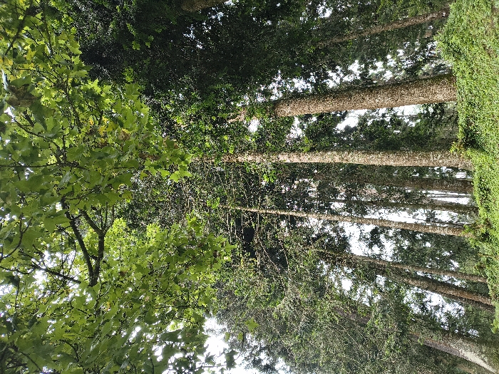 The image presents a forest scene with tall, slender trees lined up closely, their trunks a light brown color. On the left, there's a separate tree with vibrant green leaves, possibly a different species than the primary trees. The dense canopy above filters the sunlight, creating a mosaic of light and shadow. On the right side, a strip of green vegetation runs parallel to the trees. The overall impression is of looking upwards within a dense woodland.