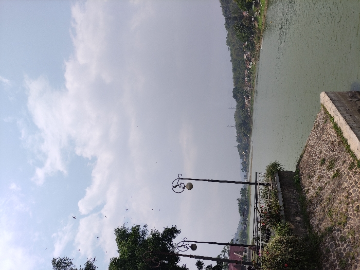 A wide-angle outdoor shot depicts a scenic overview in Nieste, Germany, under a bright, partly cloudy sky. In the immediate foreground on the left, two ornate black lampposts featuring globe-shaped lights are partially obscured by dense dark green tree foliage. Below the lampposts, a raised concrete and stone embankment, adorned with a black metal railing, supports a growth of green vines and small red flowers. This structure descends to meet a large body of greenish-gray water that dominates the central and right areas of the image. The water's surface shows subtle rippling. Across the water, the distant bank is lined with numerous green trees and scattered residential buildings, indicating a populated, vegetated shoreline that extends towards a series of low hills. Utility poles with power lines are visible traversing the distant landscape. Multiple small, dark specks are observed in the sky, primarily in the upper left quadrant, consistent with birds in flight. No human figures are present within the scene.