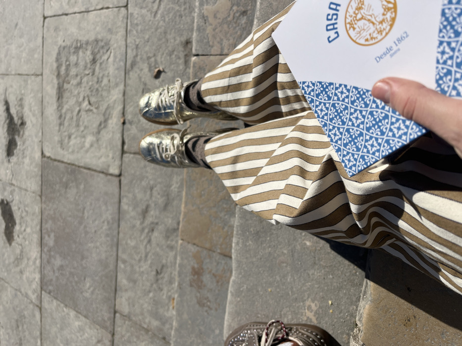 The image depicts a first-person, downward view of an individual's lower body and feet, situated outdoors on gray stone steps and paving. The individual wears wide-leg trousers featuring alternating vertical cream and light brown stripes. Gold metallic lace-up sneakers with gum-colored soles are worn over brown socks. The left hand of the individual holds a white box or brochure that displays a blue geometric pattern on its corners and the text "CASA Piriquita Desde 1862" with a corresponding logo. To the far left, on a lower stone step, the toe of a second, dark brown or bronze studded shoe with red and white laces is visible. The environment consists of large, irregularly shaped gray flagstones and steps, illuminated by bright, direct sunlight that casts distinct shadows. Based on the "CASA Piriquita Desde 1862" branding, the location is identified as being in or immediately outside Casa Piriquita, a known establishment in Sintra, Portugal, specifically at Rua das Padarias 1/7, which falls within the civil parish of Santa Maria e São Miguel (part of the União das Freguesias de Sintra).