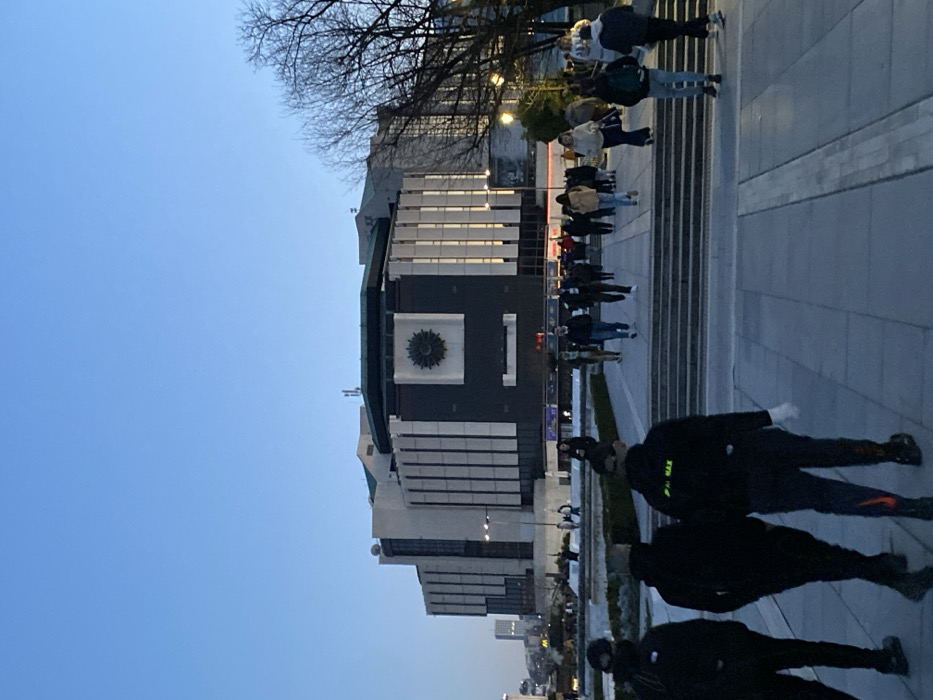 The image displays an outdoor urban scene centered on the National Palace of Culture (NDK) in Sofia, Bulgaria, observed during twilight hours under a clear, light blue sky. The NDK, a large multi-story structure with a distinctive modernist or brutalist architectural style, dominates the background. Its facade features alternating dark and light vertical panels, with a large circular emblem resembling a stylized sun at its center. Internal lighting is visible through numerous vertical windows. In the foreground and midground, a wide, paved plaza extends towards a series of broad steps leading up to the NDK entrance. Approximately 20-30 individuals are visible, primarily engaged in walking across the plaza and ascending the steps. In the immediate foreground, three individuals are seen from behind, walking rightward; one wears a black hoodie with "AIR MAX" in neon green lettering on the back and a white glove on the right hand. To the left of the plaza, a low concrete structure, possibly a planter or decorative pool edge, contains sparse vegetation. Bare tree branches are visible on the right side of the image, obscuring part of the building. Distant city buildings, including a taller structure, are discernible on the horizon to the far left. Streetlights are illuminated, casting light onto parts of the plaza and the building. No overt interactions between individuals are discernible; most appear to be in transit.