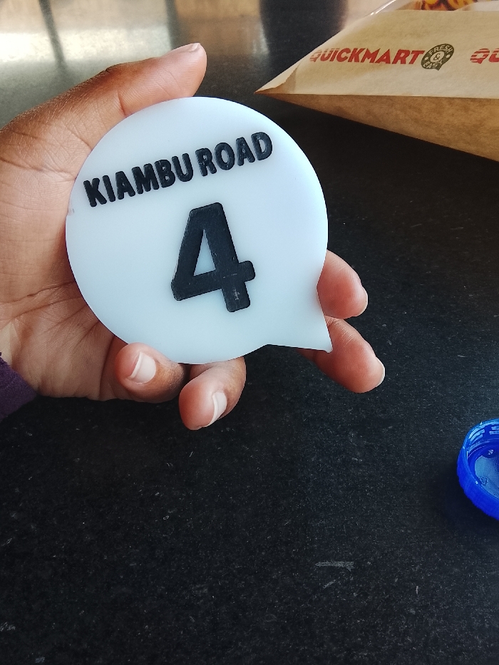A hand holds a white, rounded sign resembling a speech bubble, emblazoned with "KIAMBU ROAD" above a large "4" in black lettering. The sign appears to be made of plastic or acrylic. A brown Quickmart paper bag sits in the background. A blue plastic bottle cap is located to the right on a black surface. The scene seems to be set on a table.