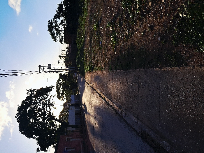 A sun-drenched, angled view captures a narrow asphalt road winding through a tropical locale. A dense row of vibrant green foliage and trees line one side. Distant palm trees and utility poles punctuate the horizon. Houses and trees flank the road. The left sky showcases scattered clouds against a clear blue backdrop. The light creates shadows on the road surface.