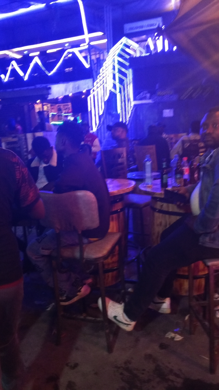 People sit at barrel tables under vibrant blue neon lights at a bar or club. Some face away, while one man gazes directly at the camera. Drinks are scattered on the tables alongside bottles. The lighting casts shadows, but the sneakers of the seated patrons are visible on the floor. The atmosphere suggests a lively night out.