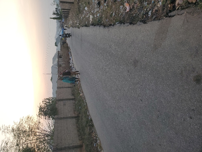 An asphalt road stretches into the distance under a light sky. Two people stand by a wall, and a motorcycle approaches further down the road. The road's edges are lined with overgrown vegetation and scattered debris. A wall with some trees runs alongside a portion of the road. The scene has a rural or suburban feel.