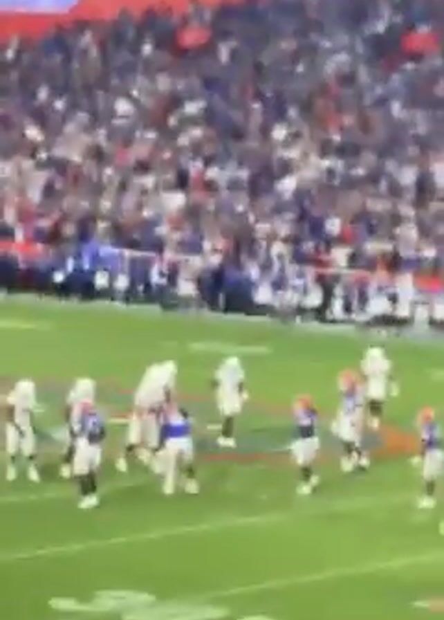 wide shot of a football game being played in a stadium. The stands are packed with a crowd of spectators, mostly wearing white, with some blue and orange visible. The football field is green, and there are players in white and blue uniforms. The players in blue are closest to the camera. There are yard lines marked on the field. In the background, a large sign in orange reads "The Swamp." The sky is overcast, and light shines through the clouds. The camera is slightly unsteady. The overall impression is of a high-energy, crowded sporting event.