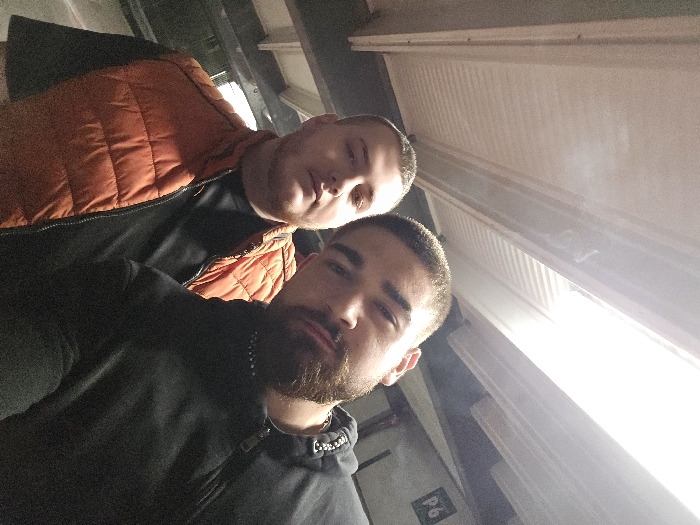 A digital image depicts two adult males posing for a selfie in an indoor parking garage, identified as being in Halle (Saale), Germany