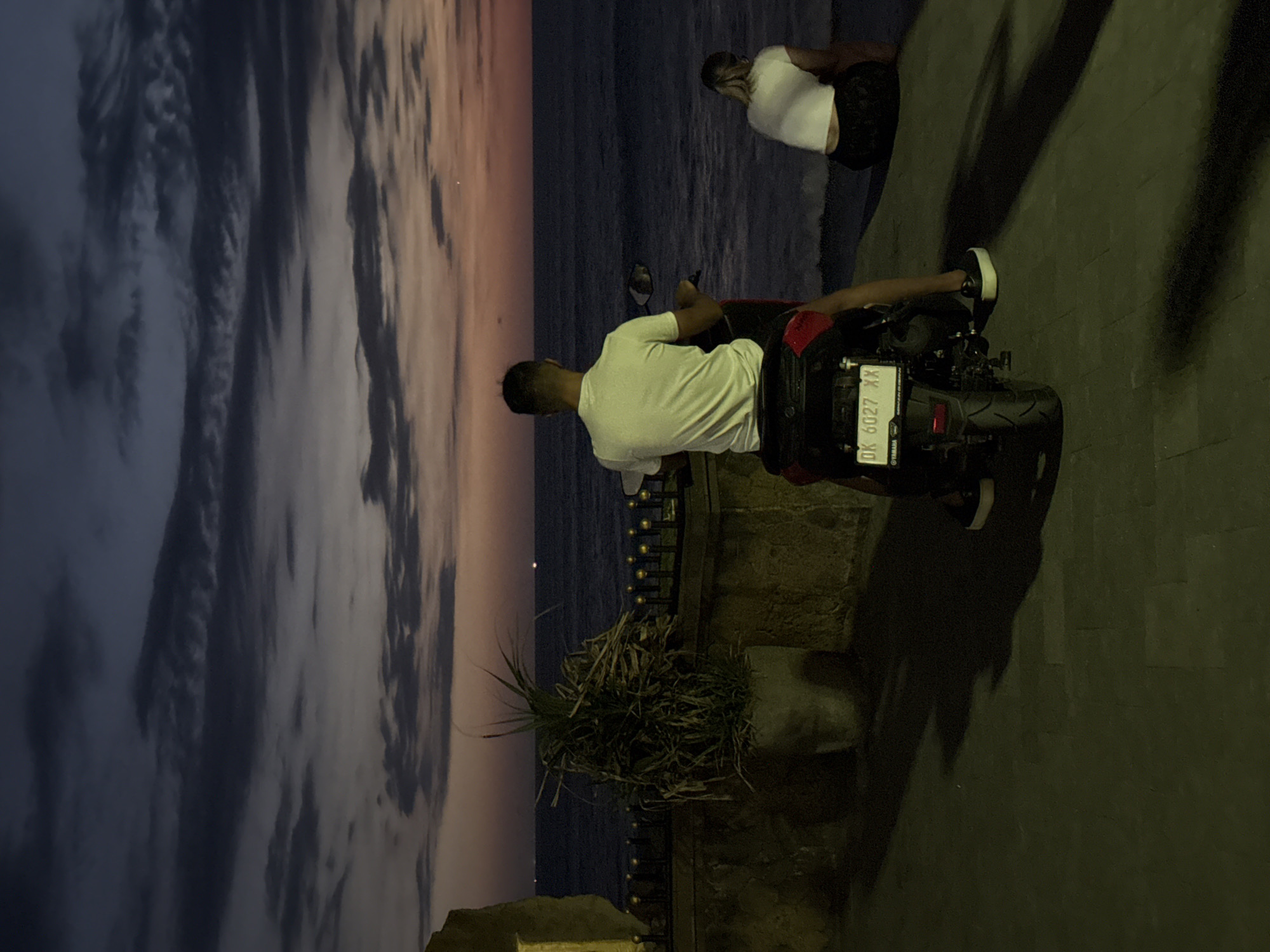 The image depicts a scene at Pererenan Beach in Bali, Indonesia, at dusk. The sky is filled with clouds, tinted with hues of blue and orange. In the foreground, a man wearing a white shirt is sitting on a scooter, facing the ocean. Behind him, another person in a white shirt is standing near the shore, also looking at the sea. The beach and ocean can be seen between the man on the scooter and the standing person. A small decorative plant is visible near the scooter. The ground is paved, and a low fence runs along the edge. The license plate on the scooter reads "DK 6027 XX," indicating the vehicle is registered in Bali.