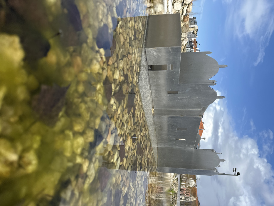 This image depicts a metallic architectural model of the Igreja da Misericórdia de Aveiro, located within a shallow water feature in Largo Dr