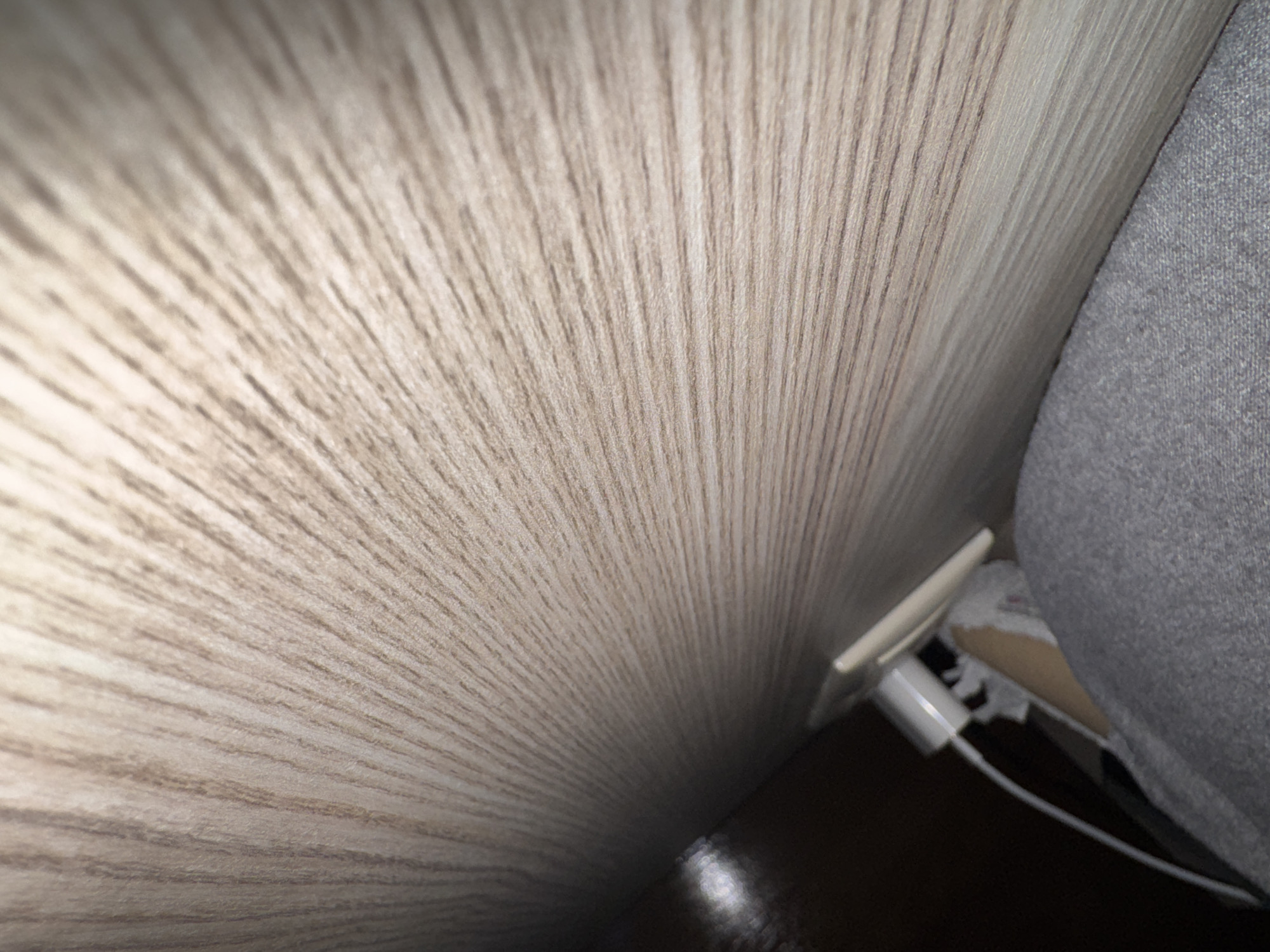 close-up of a light-colored wood-grain surface meeting a grey upholstered surface
