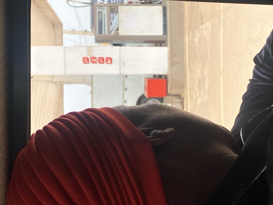 The image depicts a static scene captured from within a vehicle, looking out through a window into a gas station in Shagamu, Nigeria. In the foreground, the left side of a person's head and right shoulder are visible. The individual has dark skin and wears a prominent, pleated red turban or headwrap. Dark clothing covers their shoulder. The person is oriented towards the right side of the frame, observing the scene outside. Beyond the window, a gas station is visible under daylight conditions. A central white concrete pillar stands upright, featuring four red square hazard symbols stacked vertically on its side. To the right of this pillar, a gas pump dispenser, primarily grey and metallic with a white front panel, is partially visible. A bright red, cube-shaped object, possibly a container or cooler, rests on the ground near the base of the concrete pillar. Behind the pillar and red object, part of a white vehicle, appearing to be a truck or large van, is discernible. The ground surface of the gas station appears to be paved concrete or asphalt. Overhead lines and distant indistinct structures suggest an urban or semi-urban environment. No active interactions are depicted; the scene captures a moment of observation.