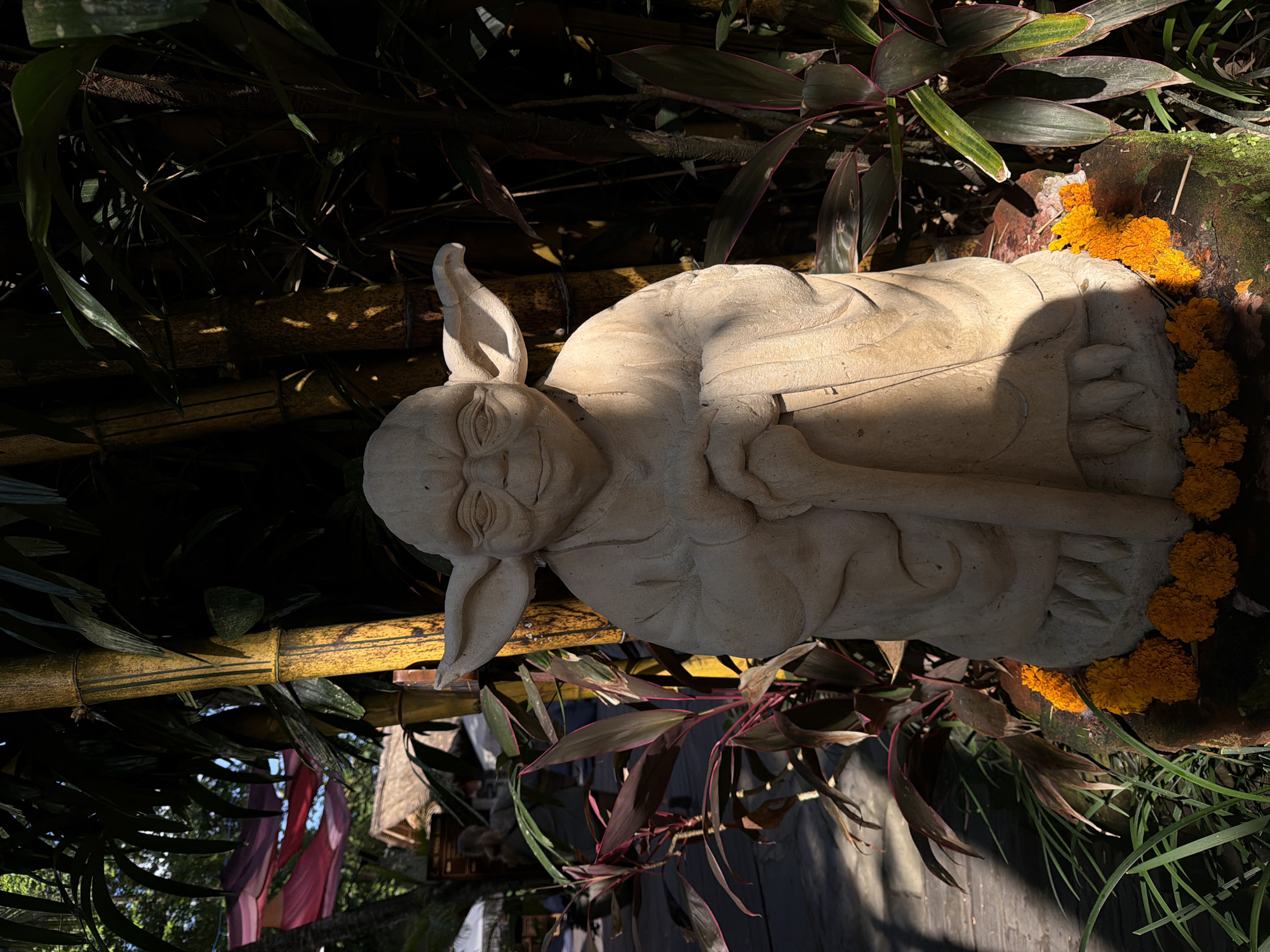 A stone Yoda statue rests in the jungle of Peliatan, Indonesia. The statue lies on its side, surrounded by bamboo shoots and orange flowers. The background includes lush tropical plants and a dark wooden structure. The lighting is a mixture of sun and shadows.