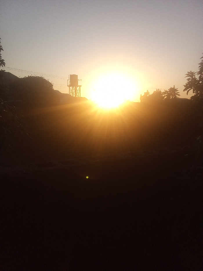 A bright, golden sunset dominates the frame, with rays of light emanating from the sun. Silhouetted trees and buildings are visible on either side of the sun. A water tower stands slightly to the left of the sun, also in silhouette. The foreground is dark and indistinct, with a small green dot appearing near the bottom center. The sky is a light gradient, transitioning from pale blue at the top to a warmer hue near the sun.