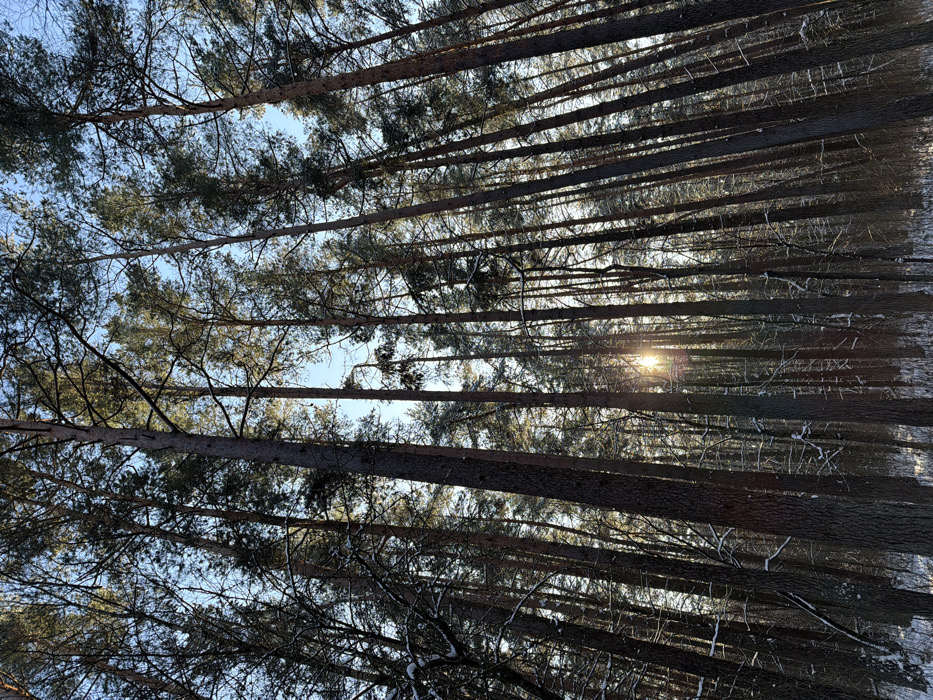 The image displays a dense coniferous forest during winter, located in a forested area of Hrodna, Belarus. The perspective is a low-angle shot, looking upwards through numerous tall, slender tree trunks, primarily pines, which extend vertically towards a clear, light blue sky. The ground and lower branches of the trees are covered with a layer of white snow. The sun is visible as a bright, starburst-like light source in the lower-middle to middle-right portion of the frame, shining through the trees and creating a warm glow. No individuals or manufactured objects are present within the scene. The overall environment is a quiet, natural winter landscape under bright sunlight.