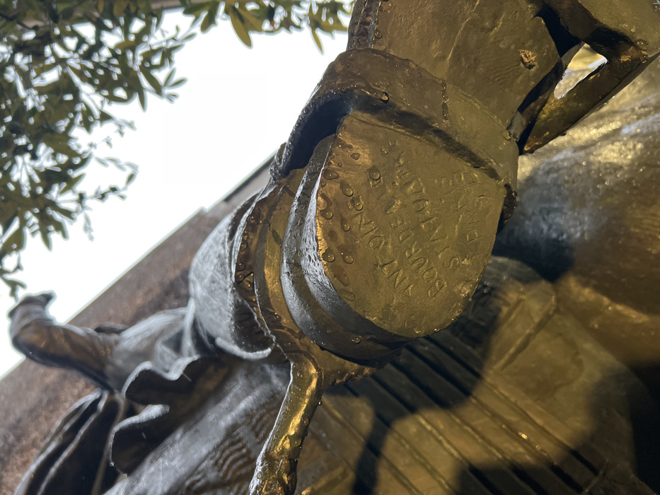 The image presents a detailed, low-angle view of a bronze statue, its surface visibly wet with numerous water droplets reflecting light