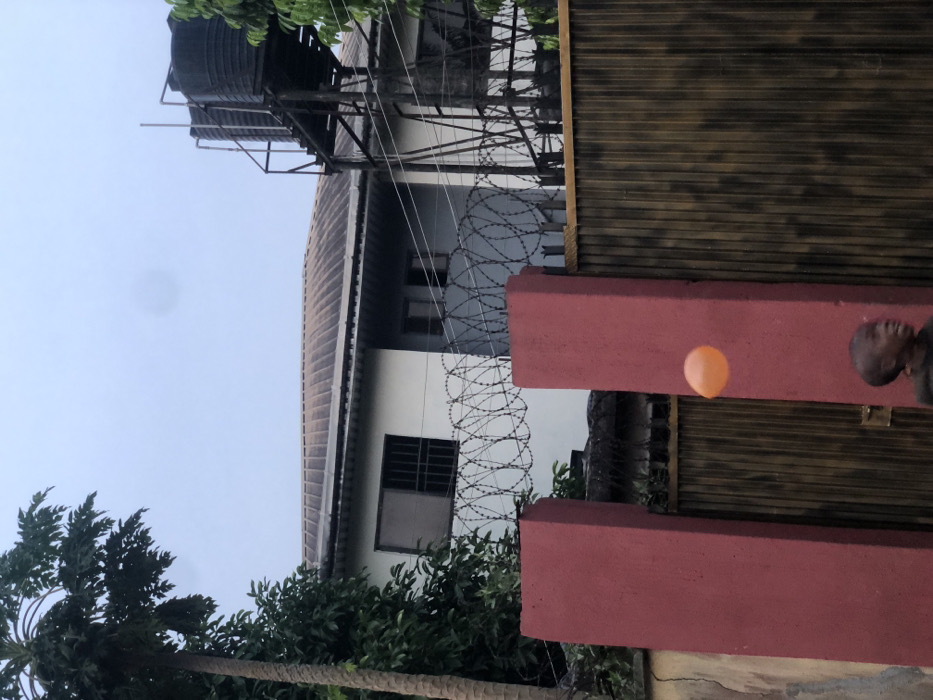 A building with a water tank on its roof is visible. Barbed wire is strung along the side of the building. A red concrete wall runs along the right side of the frame. Part of a tree and other greenery appear at the bottom of the image. An orange balloon is visible between the red concrete wall and the brown fence. The photograph is rotated.