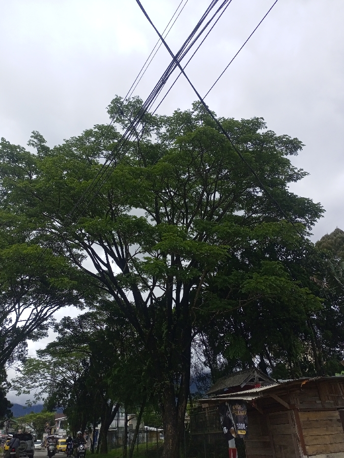 A towering green tree dominates the frame, its branches interwoven with black power lines against a cloudy sky. Beneath the tree, a street scene unfolds with cars and motorbikes navigating the road. A small wooden structure stands to the right, partially obscured by the tree's foliage, adding a touch of rustic architecture to the otherwise natural scene.